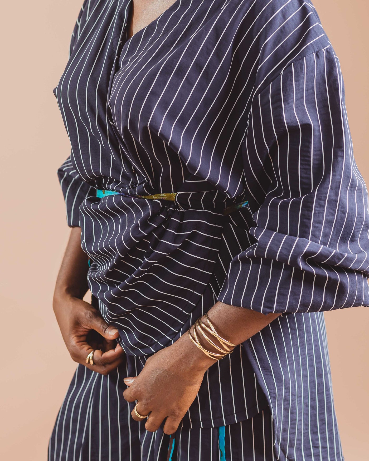 Oversize soft cotton pinstriped long sleeved shirt with baseball inspired neckline .