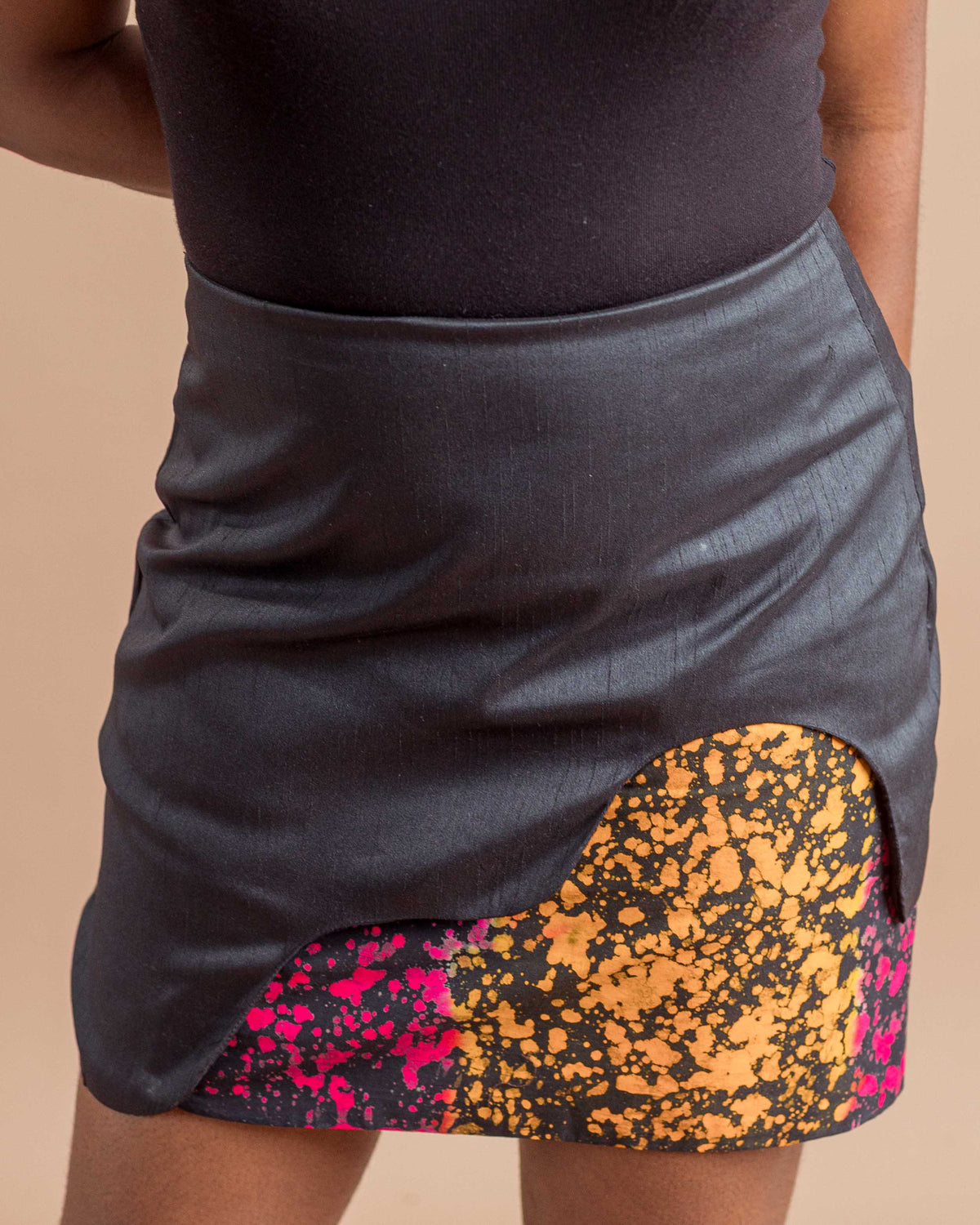 Raw silk mini skirt with an optional side ruching detail.