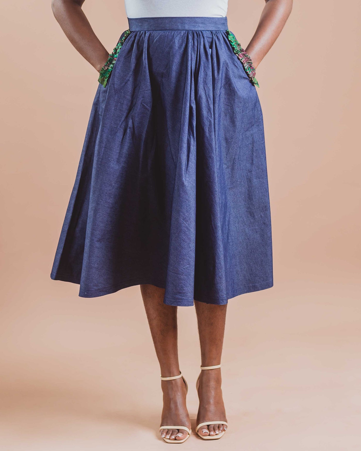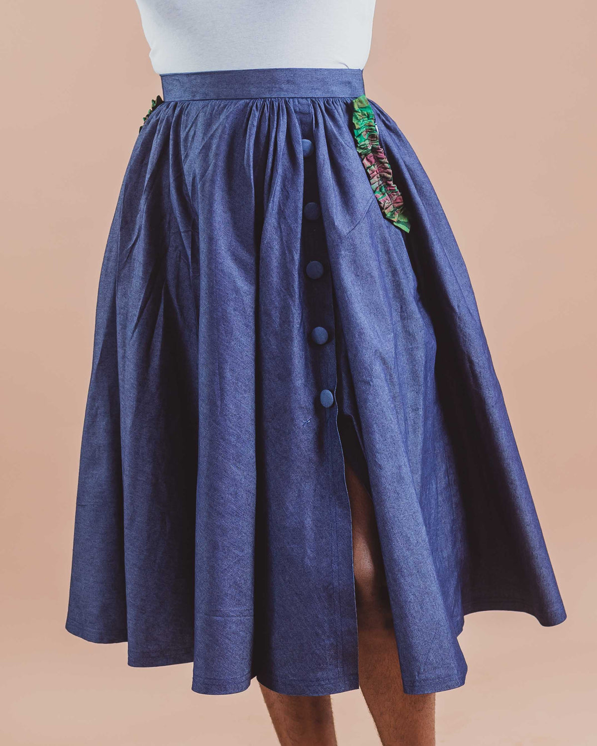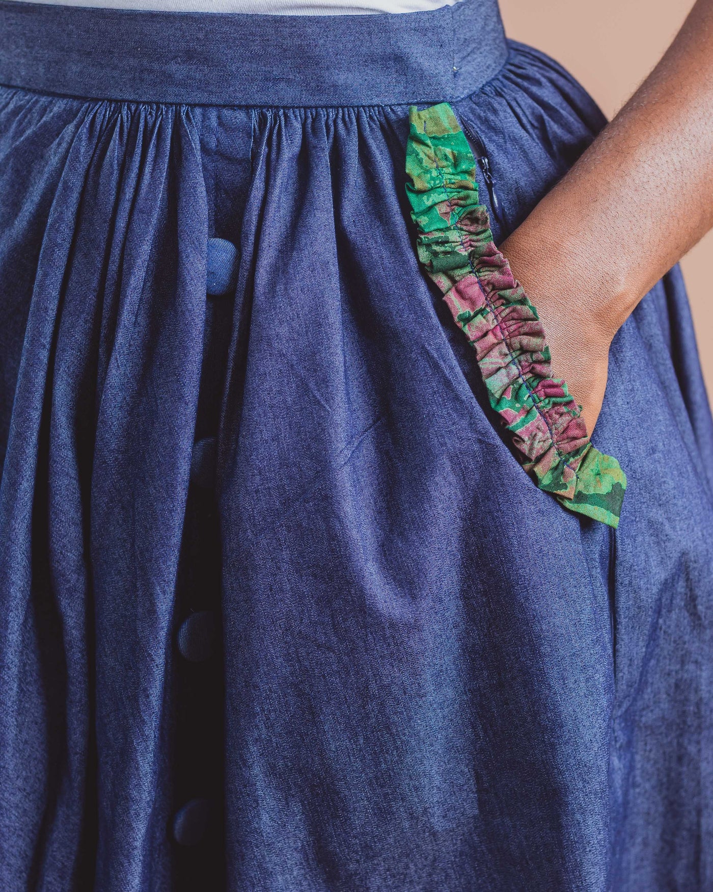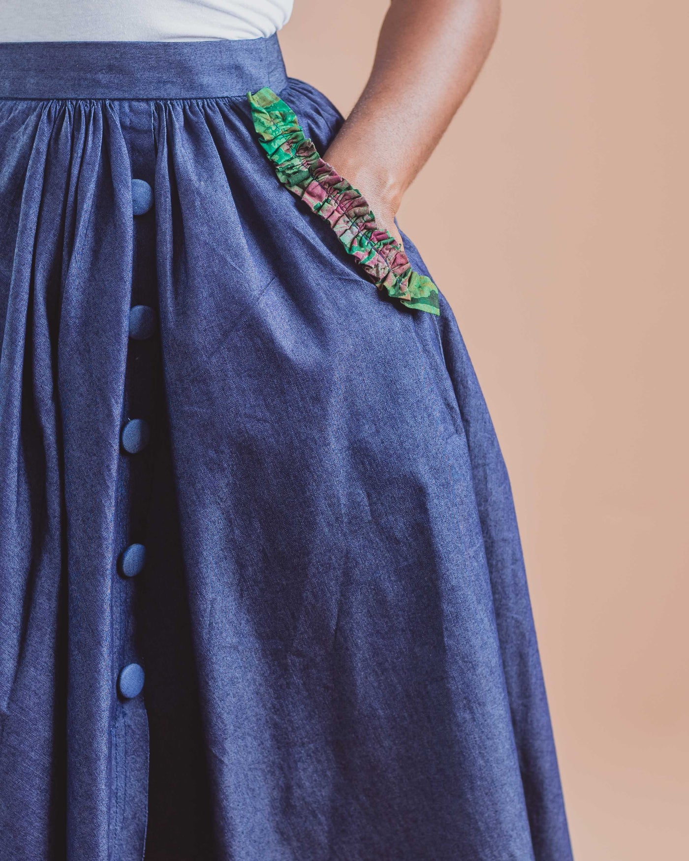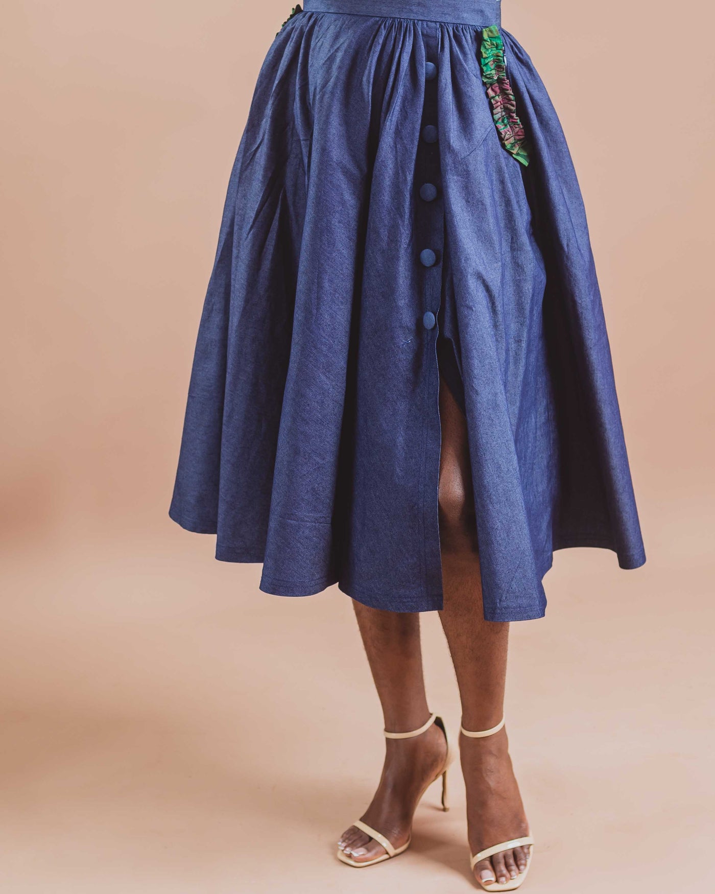 Midi Full gathered denim skirt featuring front slit adorned with covered buttons . SENA has inside pockets and a side zip.